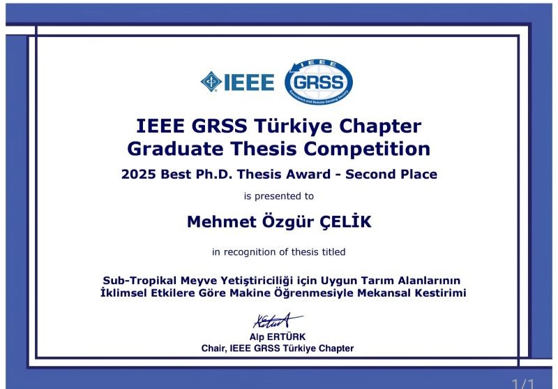 Mersin Üniversitesi Fen Bilimleri Enstitüsü Uzaktan Algılama ve Coğrafi Bilgi Sistemleri Anabilim Dalı öğrencimiz Mehmet Özgür Çelik, IEEE GRSS Türkiye Chapter tarafından düzenlenen IEEE GRSS Türkiye Graduate Thesis Competition kapsamında, doktora tezi ile “2025 Best Ph.D. Thesis Award – Second Place” ödülüne layık görülmüştür.